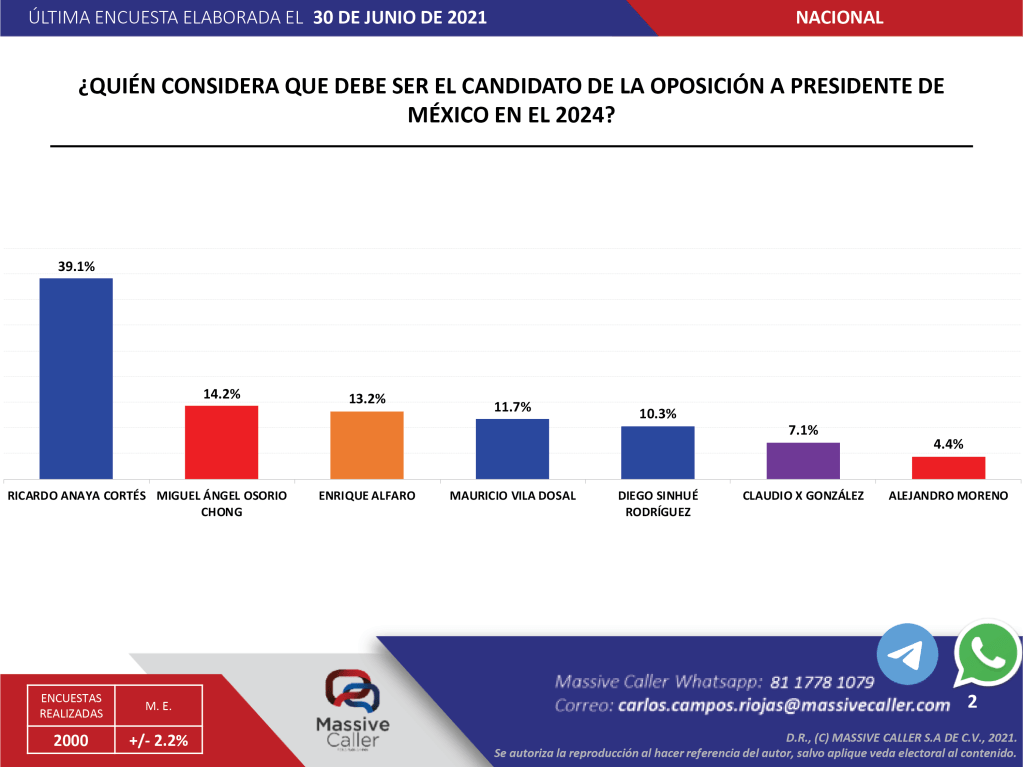 La última encuesta de Massive Caller del 30 de Junio de 2021, nos muestra cómo Ricardo Anaya Cortés sigue vigente como la persona que la mayoría de los encuestados prefiere para liderar a la oposición, es quien la mayoría piensa tiene el mejor perfil para hacerle frente a la 4T y quien sea su candidato o candidata (pendientes de la siguiente columna en la que se hablará de ello).
