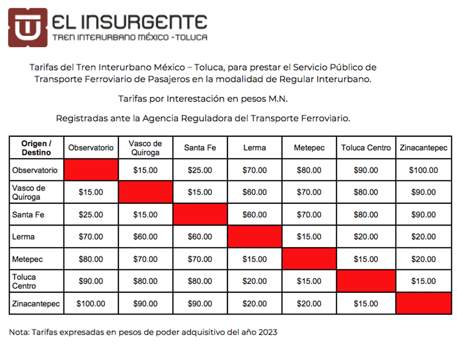 A cuatro meses de que se inaugure el Tren Interurbano “El Insurgente” en su totalidad, la Secretaría de Infraestructura, Comunicaciones y Transportes (SCIT) publicó las nuevas tarifas establecidas por la Agencia Reguladora de Transporte Ferroviario (ARTF), el cual contempla los tramos de Zinacantepec, Toluca, Metepec, Lerma, Santa fe, Vasco Quiroga y Observatorio.