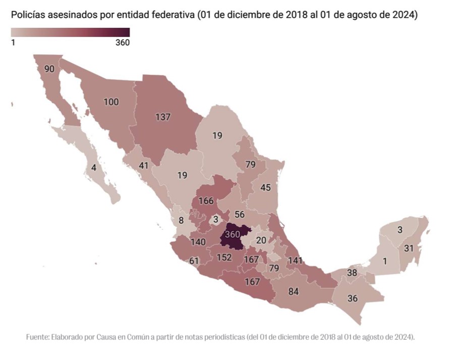 De acuerdo con el estudio “Las policías en México: radiografía de un retraso crónico (2018-2024)” de la organización “Causa en Común”, al menos 2,247 policías, de las distintas corporaciones, han sido asesinados en todo el territorio nacional entre el 1 de diciembre del 2018 y el 1 de agosto de 2024.