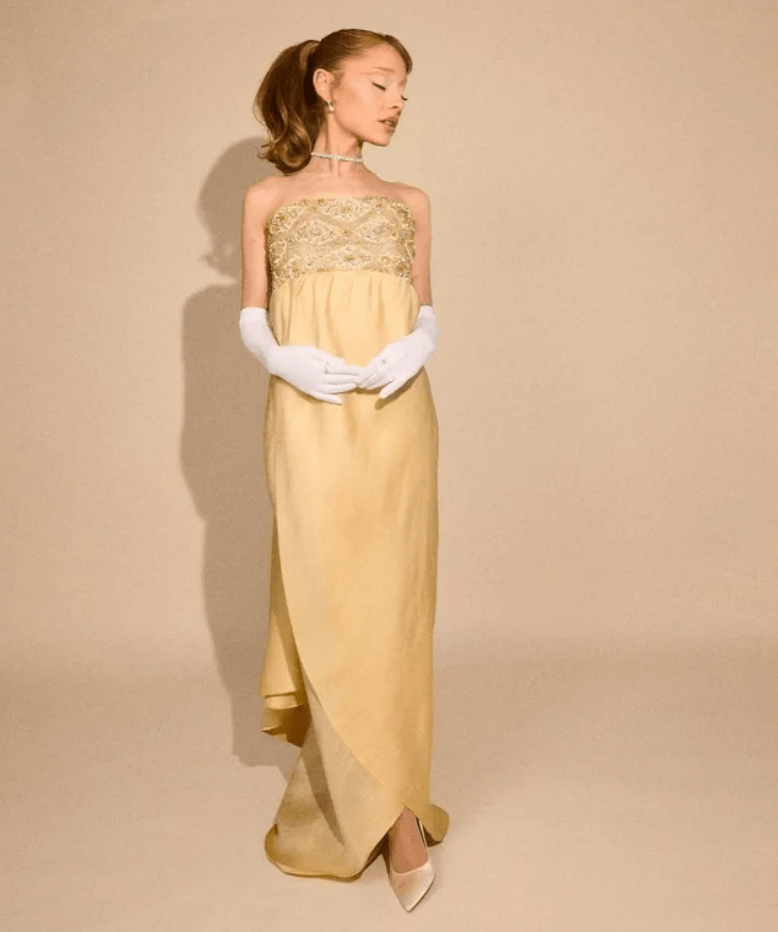Ariana optó por un nostálgico y atemporal vestido vintage de alta costura con un enorme valor cultural e histórico, pues se trata de una pieza de la colección Primavera-Verano 1966 de Hubert de Givenchy, mismo que resaltó con joyería de Swarovski, firma de la que es embajadora.